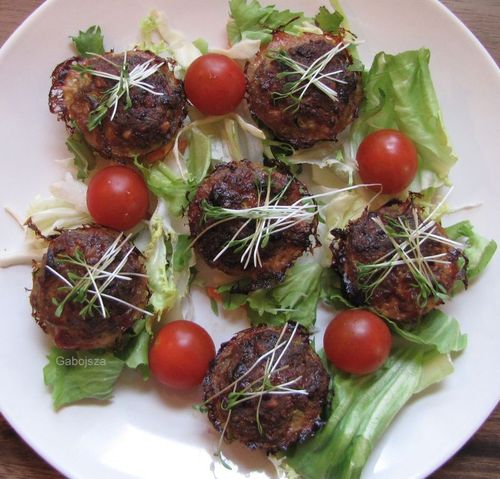 A hozzávalókat összegyúrom (zsemlemorzsa, áztatott zsemle nélkül is jól összeáll a massza!) és szilikon mini muffin formákba töltöm. 180 fokra előmelegített sütőbe 35-40 percig, illetve pirulásig sütöm.