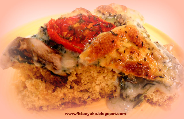 Kivesszük a sütőből , a tetejére öntjük a tejszínes spenótot, rátesszük a szeletelt zöldségeket és a tetejére a vékony szeletekre vágott olvadó növényi sajtot. További 10-12 percre visszatesszük a sütőbe. Miután megsült és a sajt is ráolvadt a tetejére, várjunk egy keveset, hogy hűljön, a tejszínes spenót megkössön picit, hogy ne folyón.