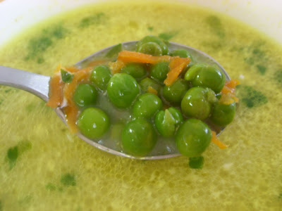 A felaprított hagymát az olíva olajon üvegesre pároljuk, majd beletesszük a zöldborsót, a reszelt sárgarépát, sózzuk és lefedve kb. 5 percig pároljuk. Felöntjük a vízzel, beledobjuk a leveskockát és addig főzzük amíg felforr. A szója tejszínt külön elkeverjük a curryvel. Majd kis lángon hozzáadjuk, állandó keverés mellet a leveshez.